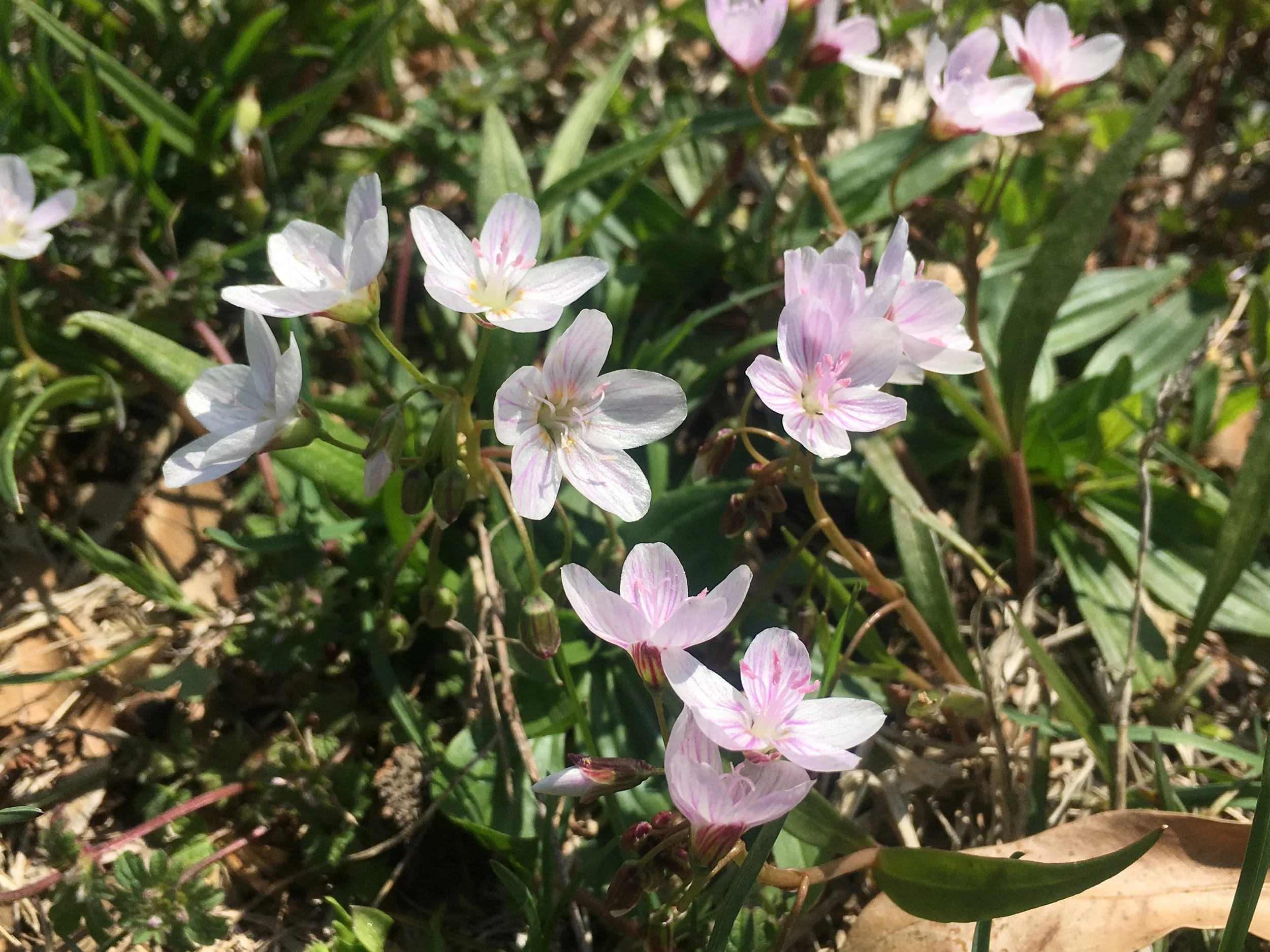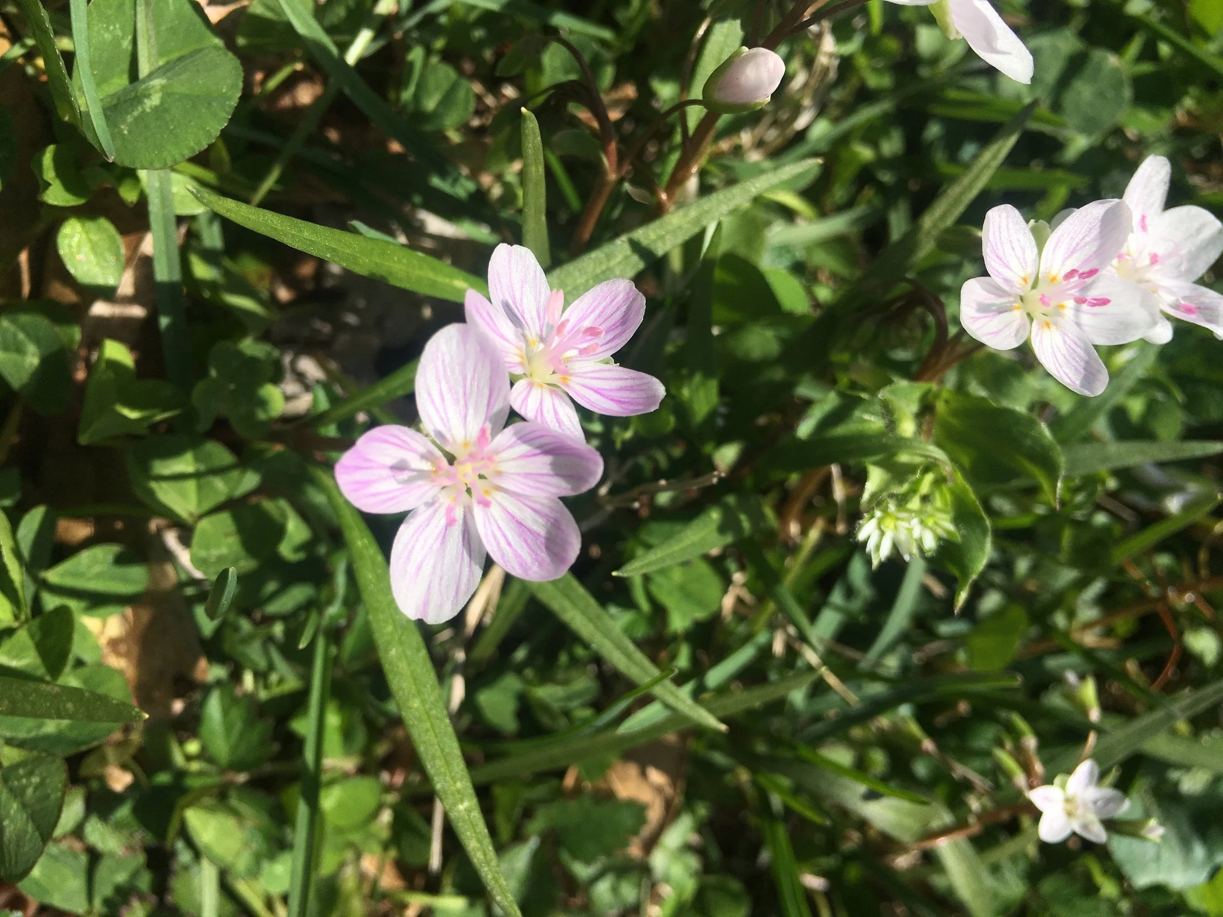 Is that snow I see on the ground in the Park? Is winter making another last gasp? Happily, no. It’s a display of a Missouri native, spring beauty (Claytonia virginica) in full bloom throughout the Park. Look for areas that seem to have a light layer of snow atop the low-growing turf and tiny emerging plants. It’s riddled with flowers that are a great pollen resource for our earliest emerging native bees and other insects. If you hold still and watch these little white flowers long enough for movement, you’ll likely see a bee or two collecting pollen on their hind legs.
