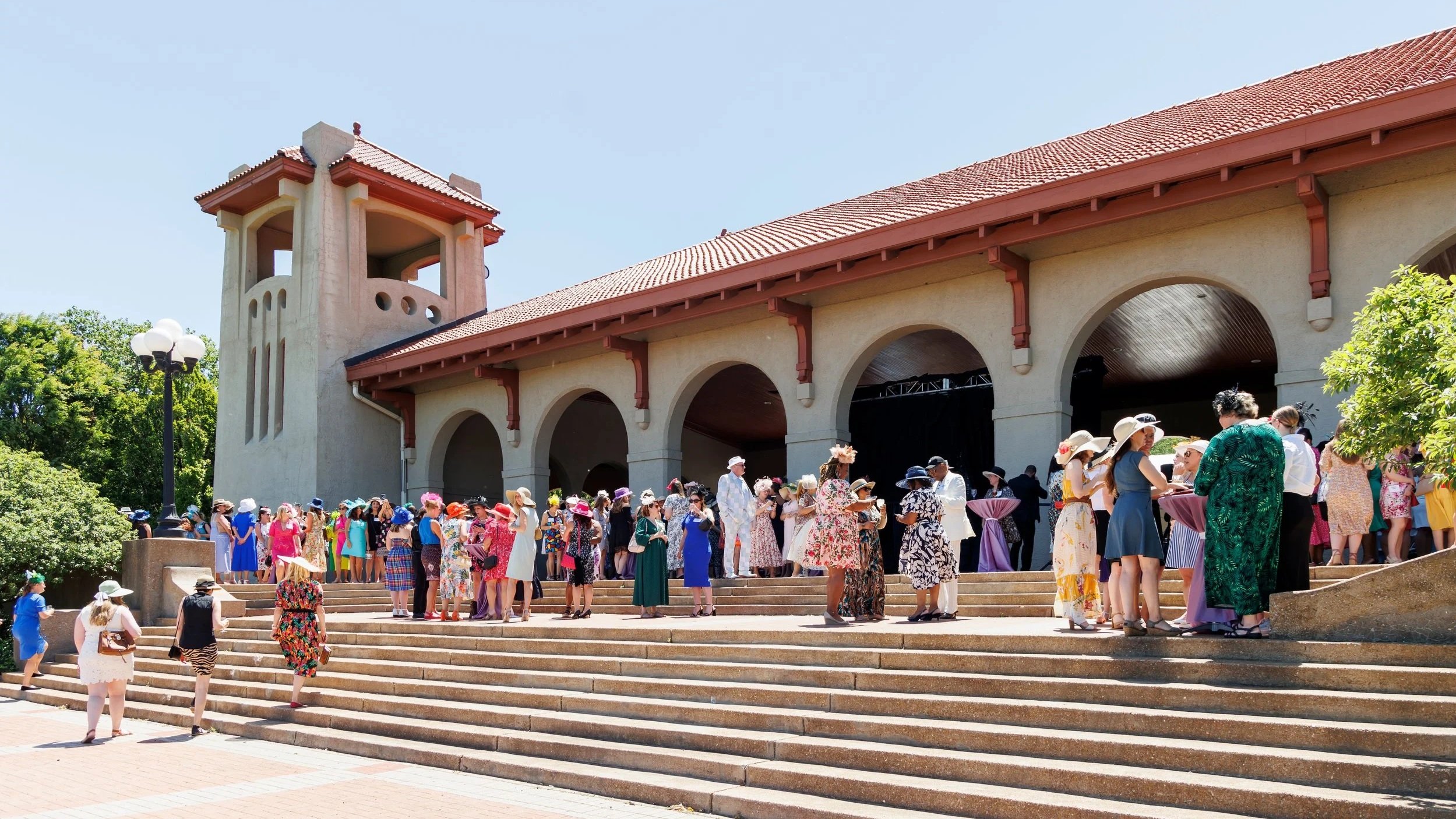 Hat Luncheon attendees mingle on the World’s Fair Pavilion steps in Forest Park