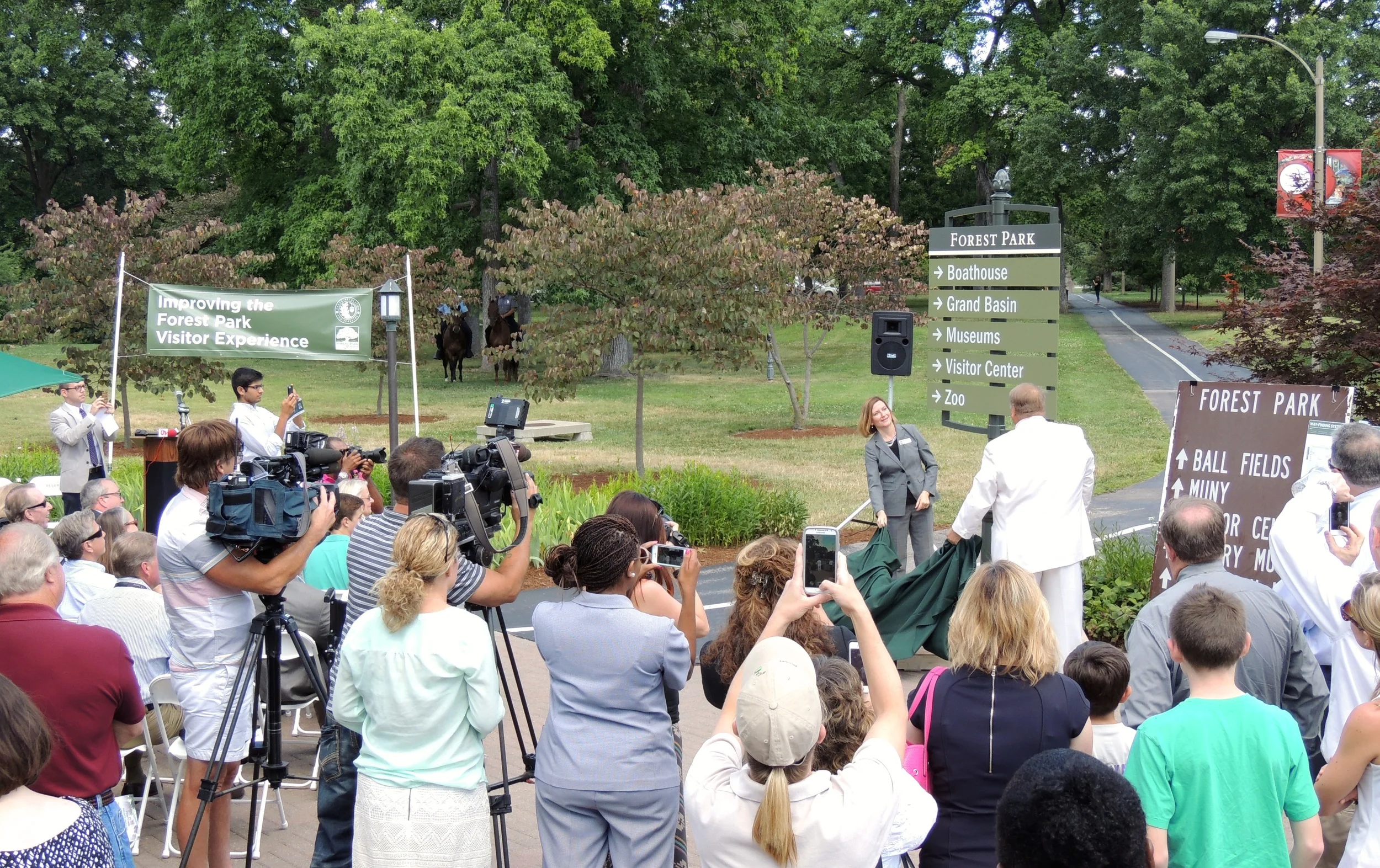 The announcements were made at an event today in Forest Park, with remarks City Parks Director Gary Bess, Board of Public Service President Richard T. Bradley, Josh Wiese from the Mayor's Office, Forest Park Forever Board Chair Steve Finerty, Forest Park Forever President & Executive Director Lesley S. Hoffarth, P.E. and Rick Ausick, Brown Shoe Company Division President for Famous Footwear. The community gathering, which included project donors, leaders from a range of Park institutions, Forest Park Forever Board members, local officials and members of the public, was capped off by an unveiling of one of the new signs, viewings of additional renderings and a community lunch of local food truck fare and ice cream.