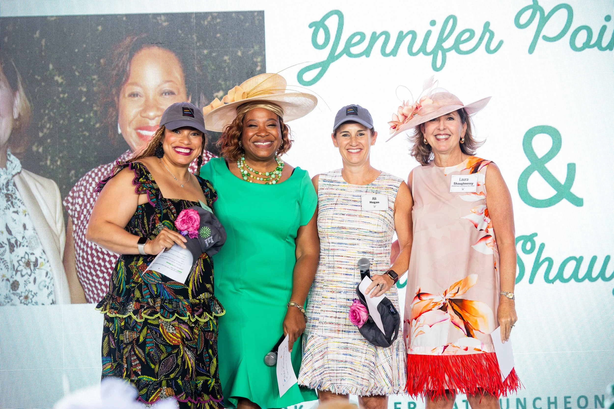 2025 Hat Luncheon co-chairs Leslie Gill (left) and Ali Hogan (second from right) with 2024 Hat Luncheon co-chairs Jennifer Poindexter and Laura Shaughnessy