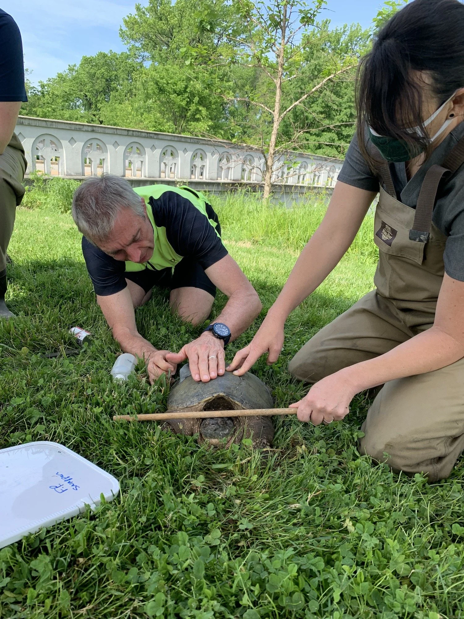 Researchers check on the health of a turtle they are monitoring in Forest Park. Photo credit Forest Park Living Lab.