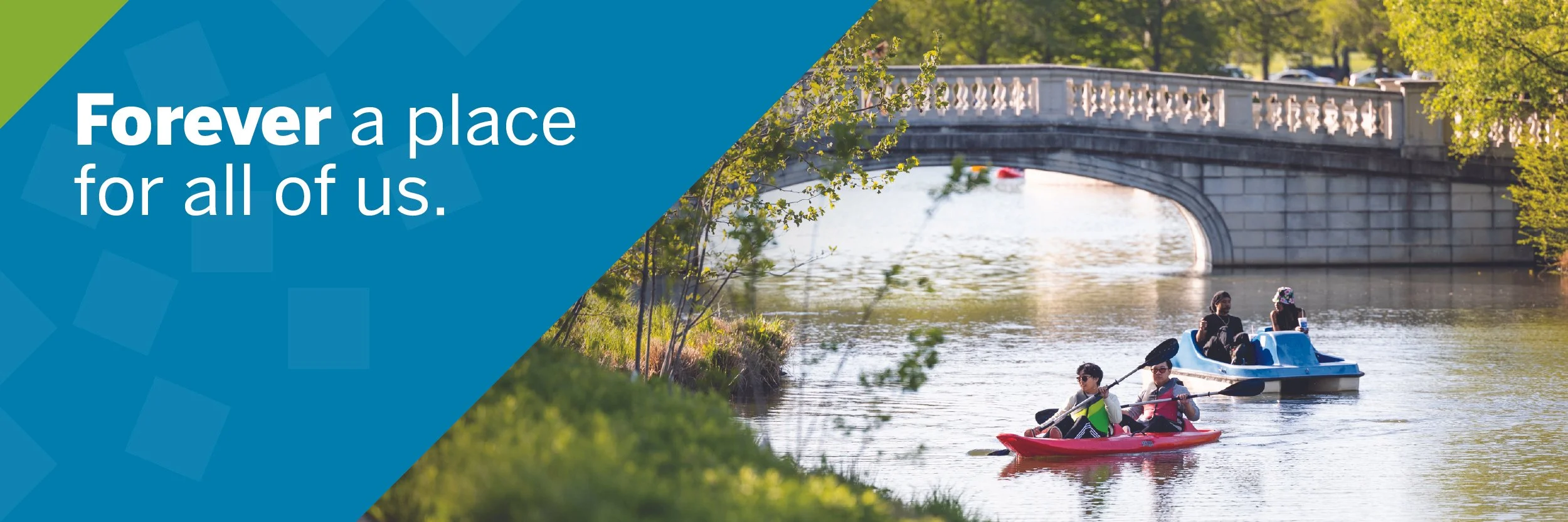 Forever a place for all of us. A Forest Park Forever graphic shows two Forest Park visitors canoeing and two more powering a paddle boat along Post-Dispatch Lake.